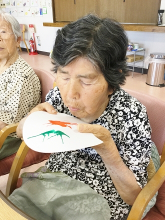 絵具を垂らして、息で吹いて模様を付けてみました。