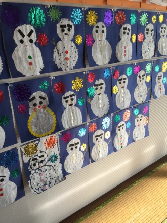 玄関の壁飾りを冬バージョンにしました。 雪だるまを貼り絵して、雪の結晶を貼って……