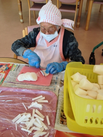 今日は、デイで収穫した大根を使って、切干大根を作りました。