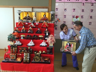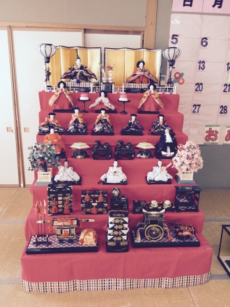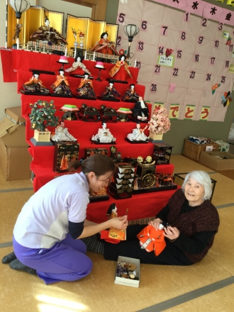 利用者様にも手伝って頂きました。昔の事で忘れたと言いながらも、皆でお内裏様がどっちだとか、右大臣は誰だとか、会話を弾ませながら飾ることができました。