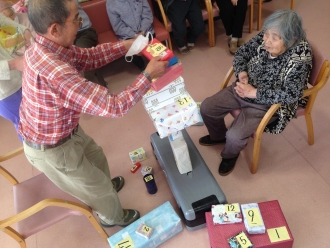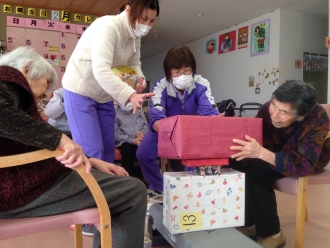 バレンタインの行事をレクリエーションにしてみました。プレゼントの箱に番号を振り、クジで引いた番号の箱を上に積んでいくという簡単なルール!!箱の大きさがバラバラなので、結構難しく、見ている方もドキドキし、皆でワーワー言いながら楽しみました(*^^)v
