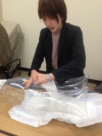 昨日の業務終了後、オムツの当て方について勉強会がありました。ライフリーの会社の方が来てくれ丁寧に教えて頂きました。