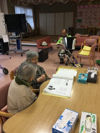 朝、デイに来た時から「今日はアコーディオンだな」と楽しみにしてくれている方もいるくらい人気の演奏会です。