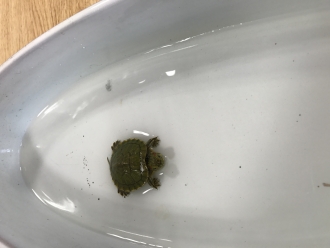 デイの敷地内にカメを発見しました。アカミミガメかな?という特徴をしていました。皆、めずらしくのぞきこむと、首を引っ込める…とても可愛いです(*^_^*)