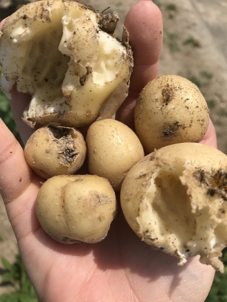 日々の日課となっております 外の散歩にでかけたところ… 畑のあちこちに なにか丸いものが… 近づいてみてみると ジャガイモの残骸が… 犯人捜しに皆で頭をフル回転 いったい 誰の仕業でしょう