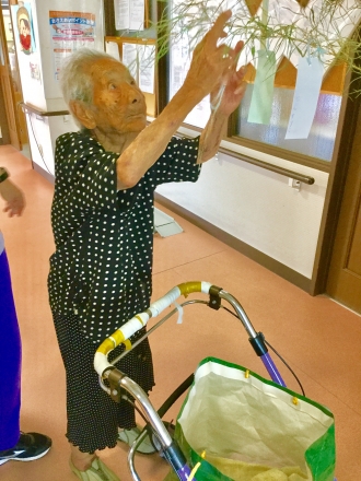 デイの玄関に竹を立て、短冊に願い事を書き、飾りつけをしました。