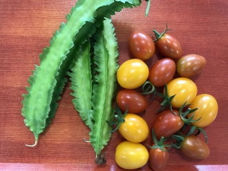 鮮やかな2種類のトマトと四角豆が育っており