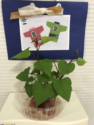 ちなみに、お芋アートできました。お芋を切って水につけて葉を育てるアートです!!