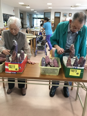 9月のレクリエーションで行った焼き芋ゲーム。焼き芋をトングで掴み、ケースに入れるタイムを競うゲームです。新聞紙をお芋の形にして絵の具で色をつけただけなのに、本物そっくりで皆ビックリしました。
