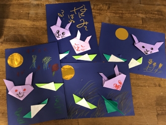 もうすぐ十五夜と言う事でうさぎとバッタを折り、すすきや歌の歌詞を描きました。秋らしいですね(*^_^*)