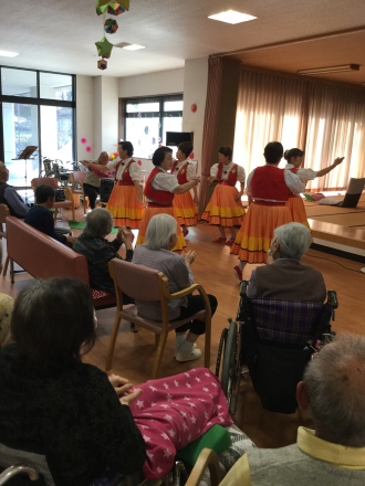 先日めだかの会のボランティアの方々が来てくださり、歌や踊りを披露して下さいました。 きらびやかな衣装でとても綺麗でした。 どじょうすくい、とても上手でした!! ありがとうございました。